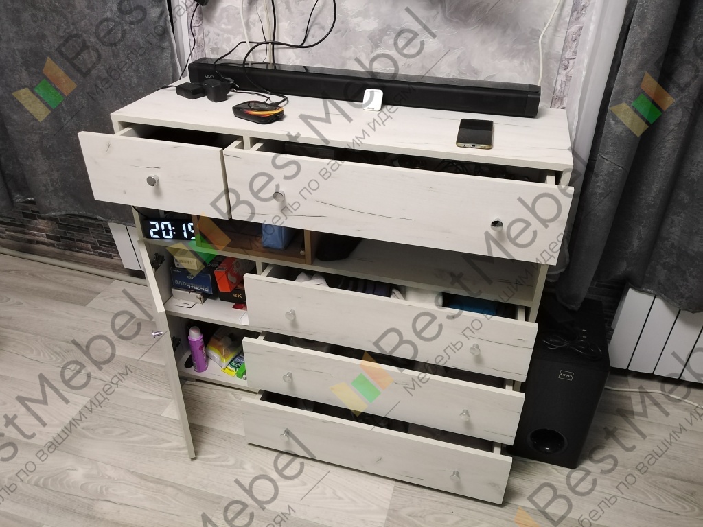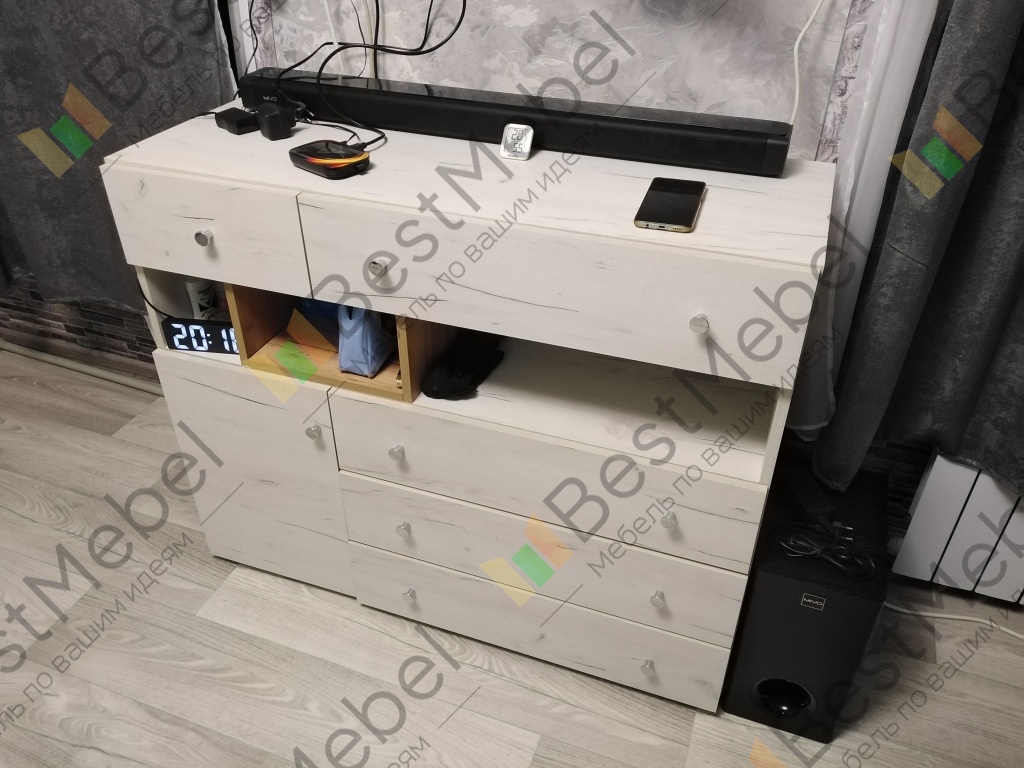 Комод понравился, собрали сами. Фурнитура качественная, приятная рукам, вместительный. Удобное расположение ящиков. Понравился современный дизайн комода. Удобно разместилась приставка с различной гарнитурой для неё. Брали в комнату подростка, ему очень понравилось по дизайну и функционалу. Хорошее сочетание цена-качество. Порадовала доставка, привезли раньше чем изначально договорились. На сайте у продавца можно настроить высоту, ширину комода и глубину ящиков.
