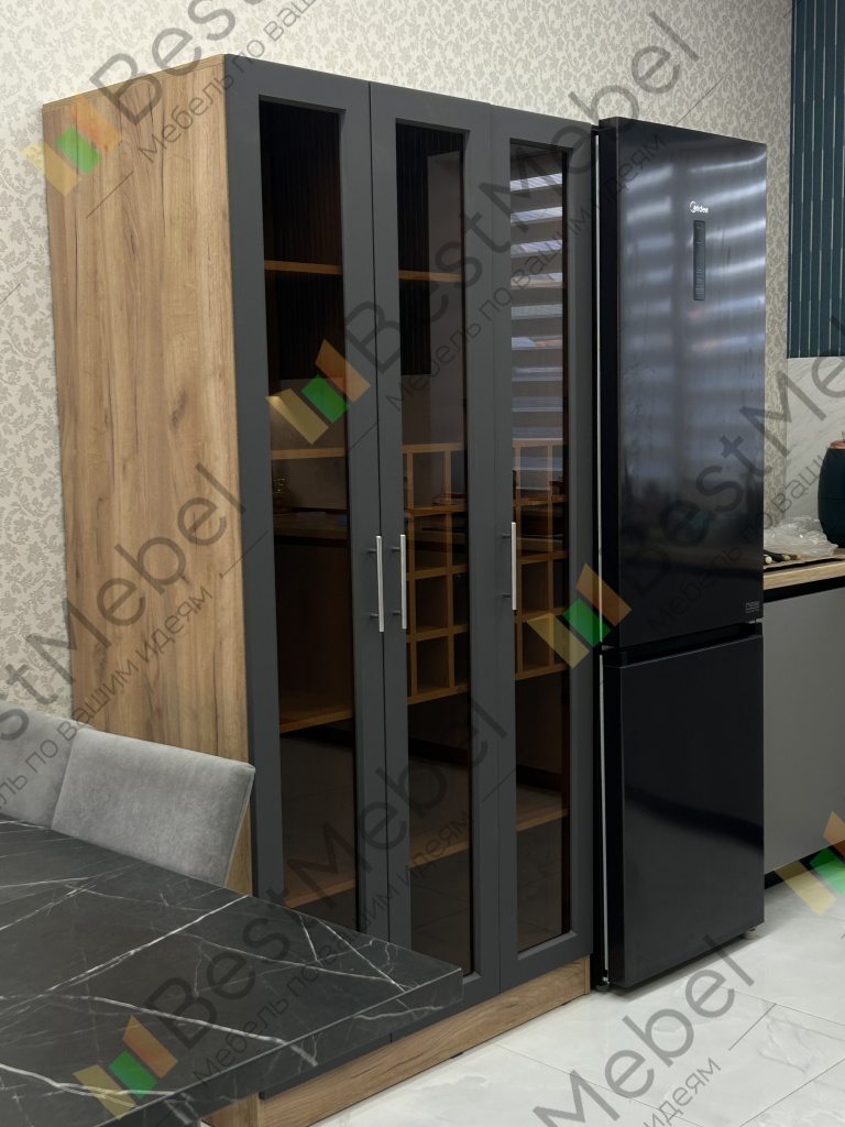 Шкаф Буффало 1 BMS представляет собой элегантную витрину с корпусом в крафтовых древесных тонах и черным рамочным фасадом. Трехдверная модель с просторными прямыми полками и квадратными ячейками предназначена для размещения винной коллекции, обеспечивая содержимому прекрасный обзор. Встроенная подсветка помогает эффектно представить бутылки с винами и придает помещению уютный и атмосферный вид. Купить шкаф Буффало 1 BMS приглашаем в наш интернет-магазин.