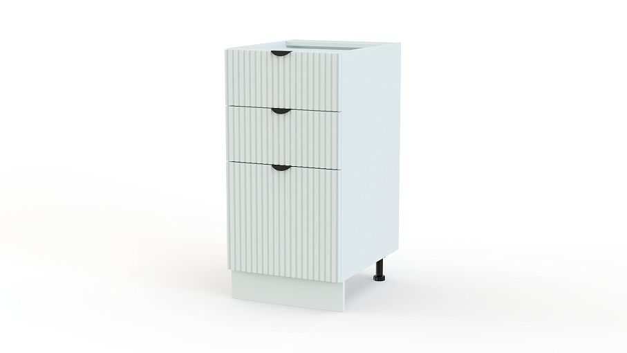 Шкаф нижний с 3-мя ящиками Альберт BMS удобен для хранения мелочей и более габаритных предметов. Один большой и два малых выдвижных ящика, оснащенных торцевыми ручками, обеспечат вам легкий доступ ко всем кухонным принадлежностям. Стильное решение для современной кухни — светлый фасад с вертикальным рельефом. Купить шкаф нижний с 3-мя ящиками Альберт BMS, изготовленный по индивидуальным размерам, вы сможете недорого на сайте нашего интернет-магазина.