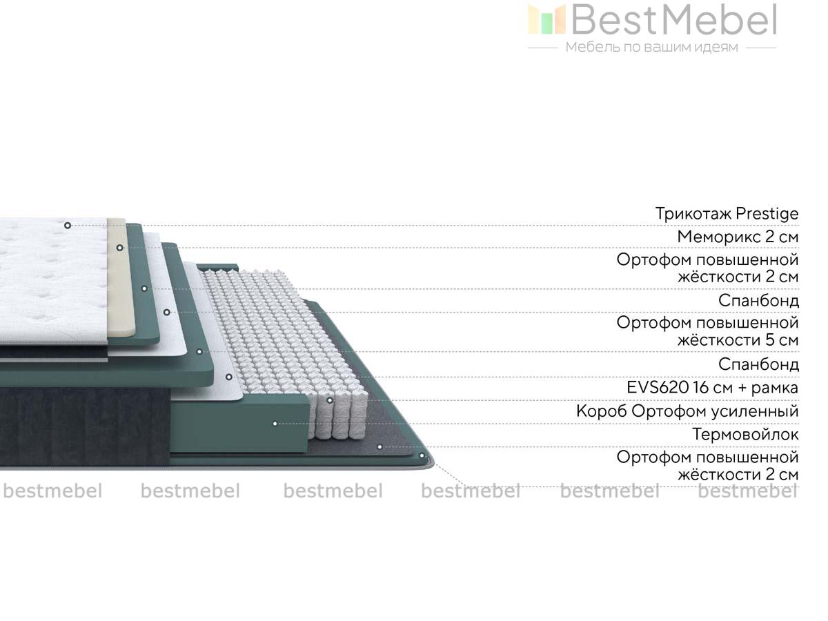 Состав: Меморикс 2см (Ортофом (ППУ) с эффектом памяти) \ Ортофом (ППУ) повышенной жесткости 2см \ Ортофом (ППУ) повышенной жесткости 5см \ Спанбонд \ EVS620 16см \ рамка к ПБ \ Термовойлок \ Ортофом (ППУ) повышенной жесткости 2см \ Короб усиленный(ВППУ).