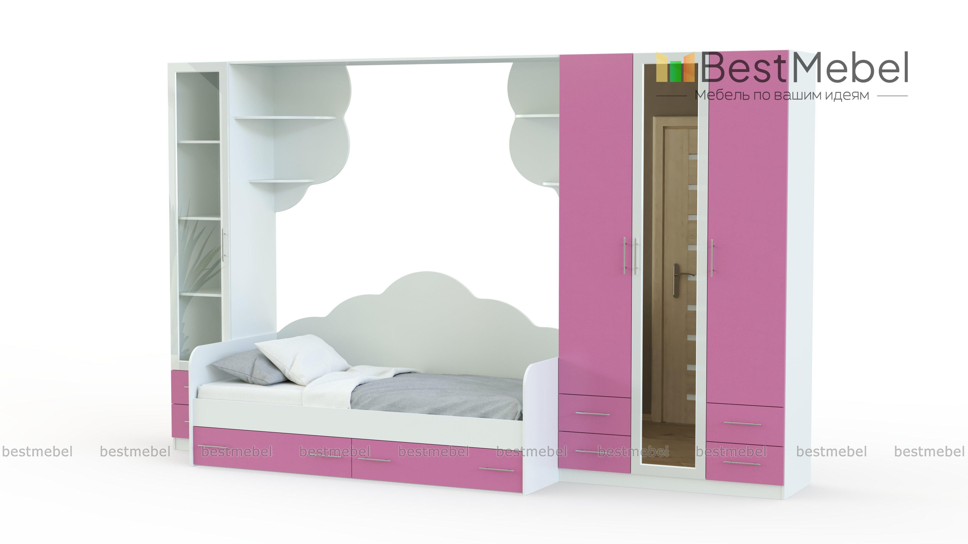 Детская Снежана BMS – нежный и романтичный комплект для девичьей спальни. Для комфортного сна и удобного размещения предметов гардероба, игрушек и аксессуаров детская оборудована вместительным распашным шкафом, высоким пеналом и удобной кроватью с ящиками для белья. Стильный акцент – фигурно вырезанные спинка кровати и задние стенки навесных полок. Купить детскую Снежана BMS, подобрав наиболее подходящее цветовое сочетание, вы сможете недорого в нашем интернет-магазине.