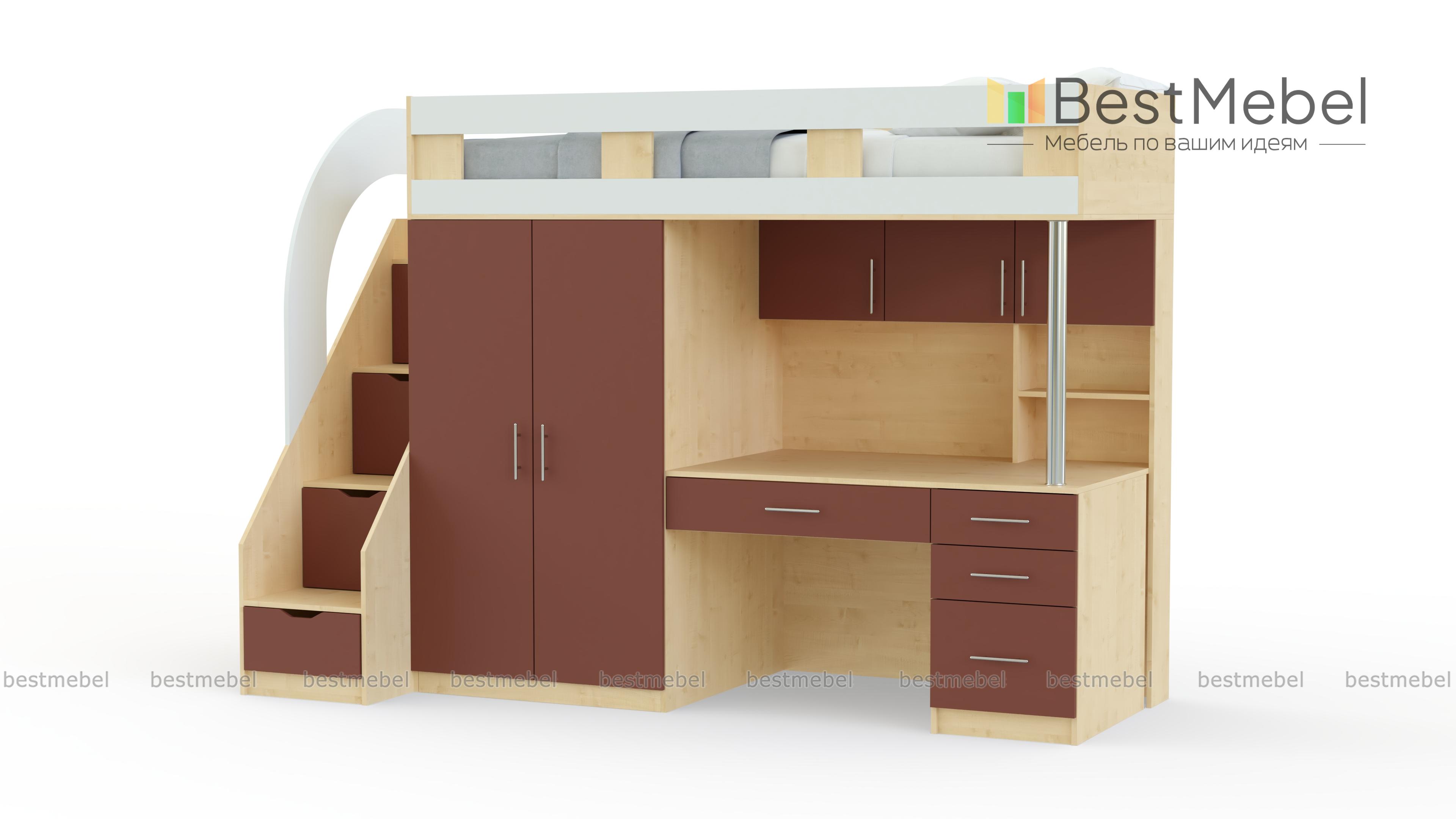 Кровать-чердак с рабочей зоной Мираж 5 BMS отличается современным дизайном, компактными размерами и функциональностью. Вы сможете обустроить комфортную зону отдыха, полноценное рабочее место и аккуратно разместите вещи ребенка. В комплекте кровать с защитным бортиком, лестница-комод, распашной шкафчик для одежды и письменный стол с выдвижными ящиками для мелочей и надстройкой с полками. Купить кровать-чердак с рабочей зоной Мираж 5 BMS приглашаем выгодно в наш интернет-магазин.