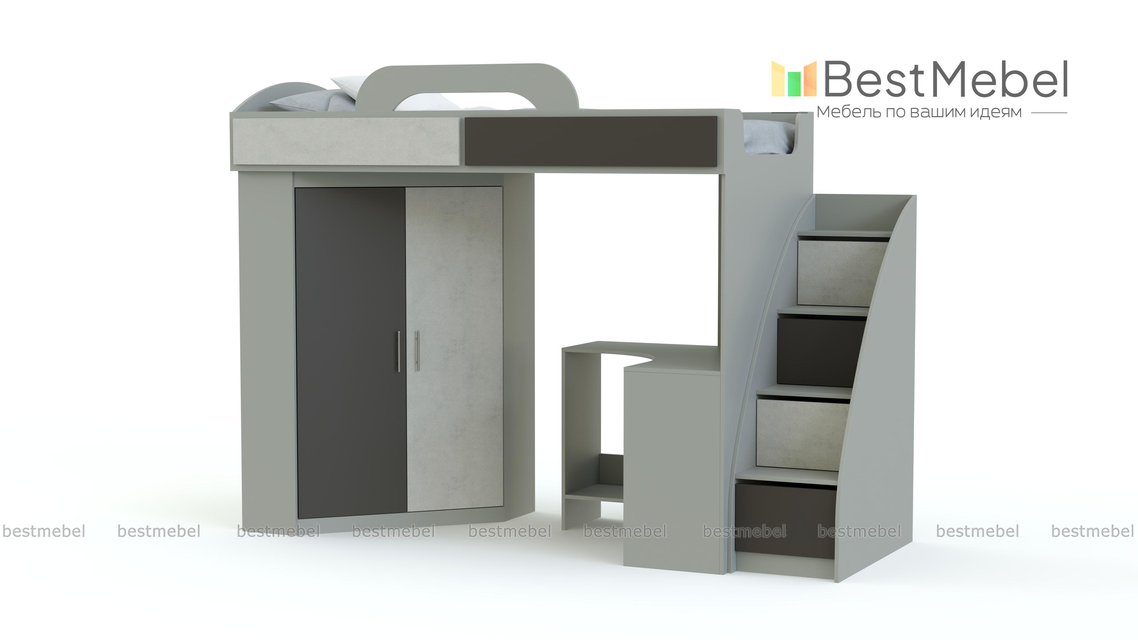 Кровать-чердак со шкафом и столом Фимо 2 BMS поможет вам создать визуально легкий и функциональный интерьер. Двухъярусная композиция включает в себя все необходимое ребенку для комфортного сна, учебы и хранения вещей – спальное место с бортиком и практичной лестницей-комодом, платяной шкаф-трапецию и угловой компьютерный столик с полкой и подставкой под монитор. Матовые фасады просты в уходе и надолго сохранят эстетичный вид. Купить кровать-чердак со шкафом и столом Фимо 2 BMS и сэкономить пространство вам поможет наш интернет-магазин.