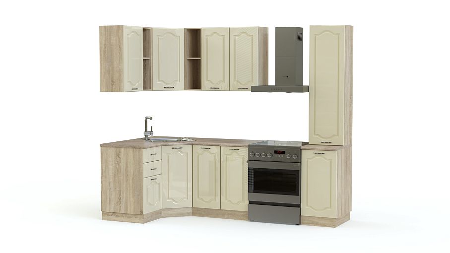 Кухня Ваниль BMS выполнена в гармоничном сочетании классических традиций и современной функциональности. Угловая конструкция позволит максимально выгодно вписать комплект в интерьер, разместив под рукой все необходимое. Четыре тумбы с выдвижными ящиками и распашными отделениями дополнены навесными шкафчиками с вертикально расположенными открытыми полками и высоким пеналом. Корпус темных тонов красиво контрастирует с нежными глянцевыми фасадами, украшенными легким декором. Купить кухню Ваниль BMS вы сможете в нашем интернет-магазине, подобрав оптимальные параметры.