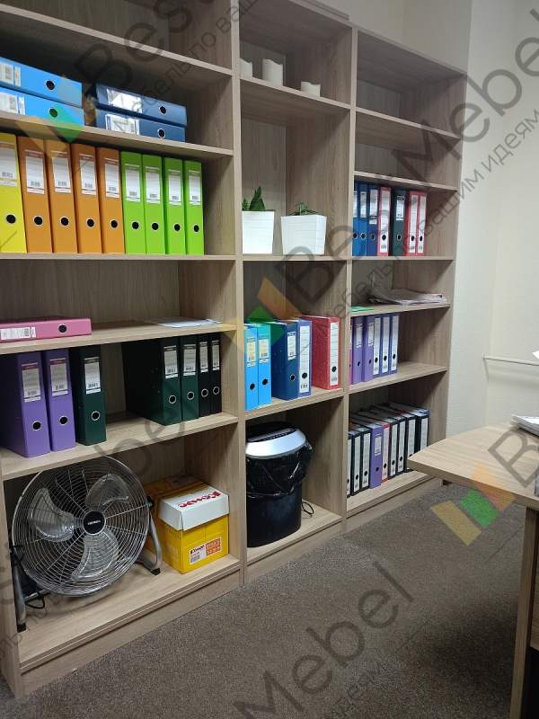 Заказали стеллаж в бухгалтерию. Немного не рассчитали расстояние между полок. Сборщик добавил отверстий, и получилось неплохо. Фото прикладываю. Цвет практически совпал с основной мебелью.