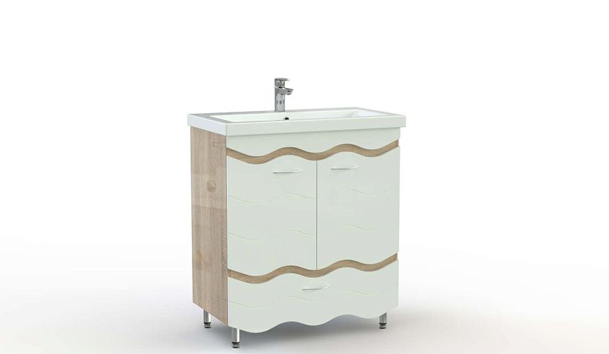 Тумба для ванной комнаты Нео 3.1 BMS предназначена для просторных помещений и отличается ярким современным дизайном. Широкая напольная модель устойчива благодаря регулируемым хромированным опорам, корпус древесного цвета скомбинирован с волнообразно вырезанным по краю белым фасадом. Все необходимые аксессуары и уходовые средства легко разместятся в двухдверном распашном отделении и выдвижном ящике. Купить тумбу для ванной комнаты Нео 3.1 BMS вы сможете в нашем интернет-магазине.