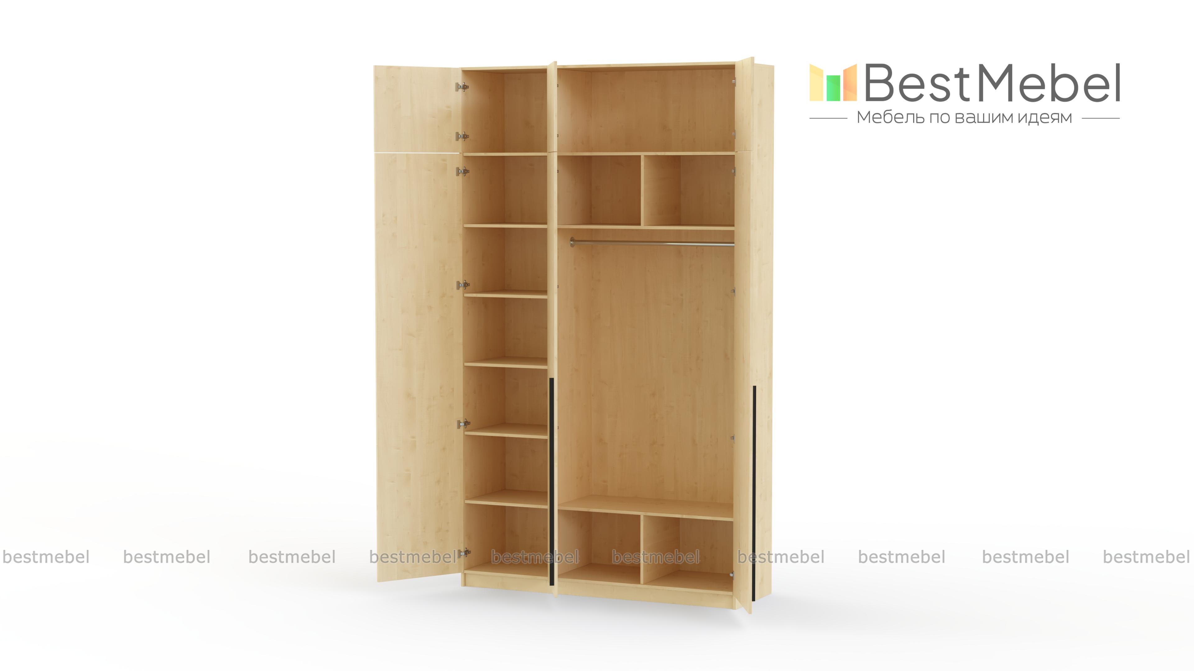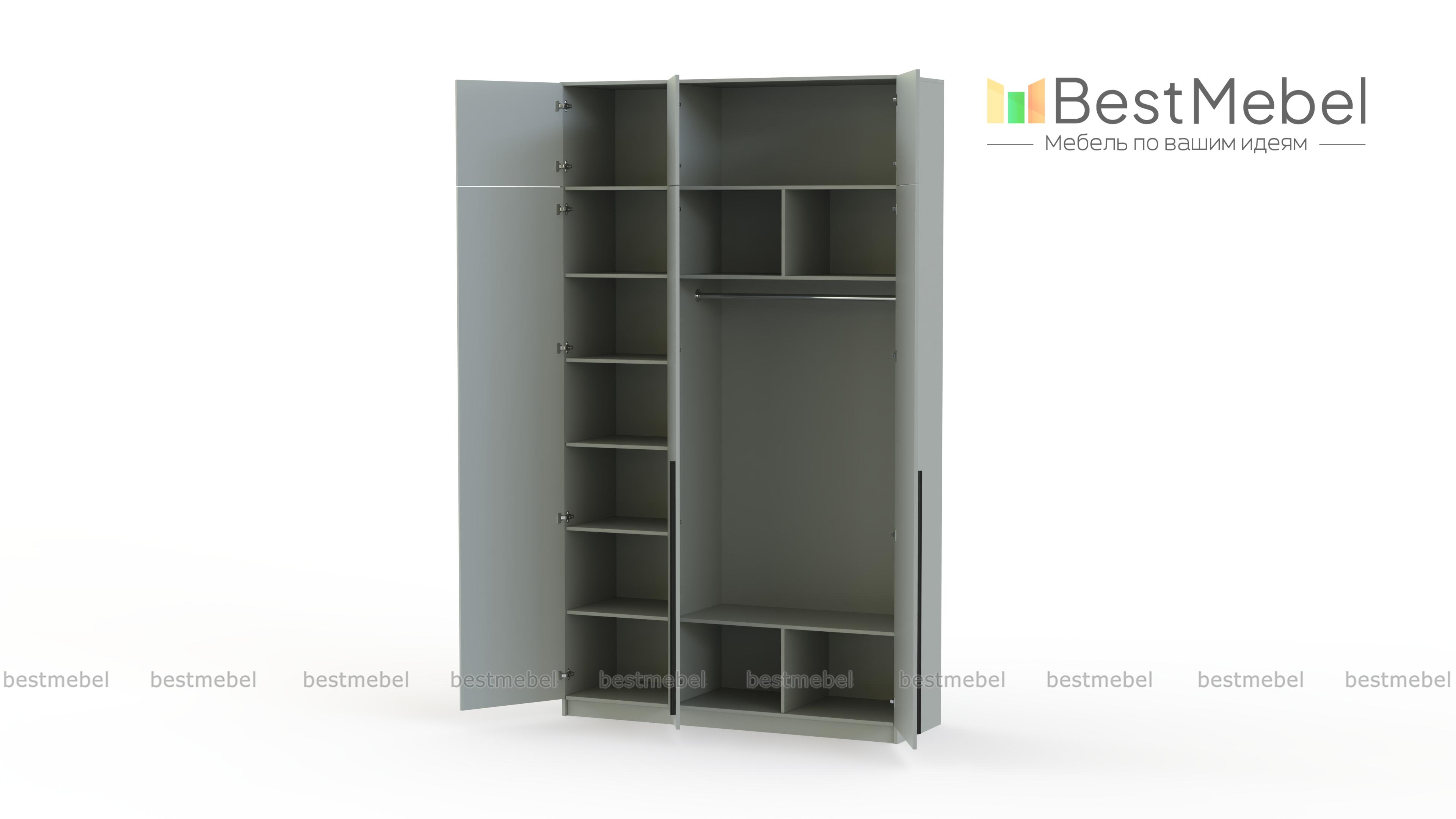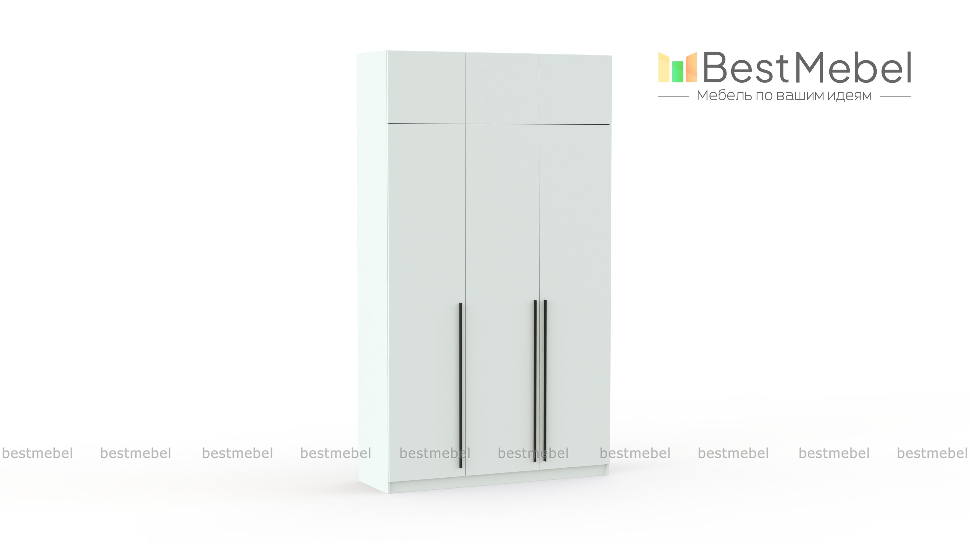 Шкаф распашной Айва 19 BMS с антресолью максимально эффективно использует пространство — от пола до потолка. Для вашего повседневного гардероба и редко используемых вещей предусмотрены просторные полки на разной высоте и платяная штанга. Сплошной фасад выполнен в классическом светлом оттенке, на дверцы установлены удлиненные контрастные ручки. Купить шкаф распашной Айва 19 BMS с изготовлением по индивидуальным размерам вы сможете на сайте нашего интернет-магазина.
