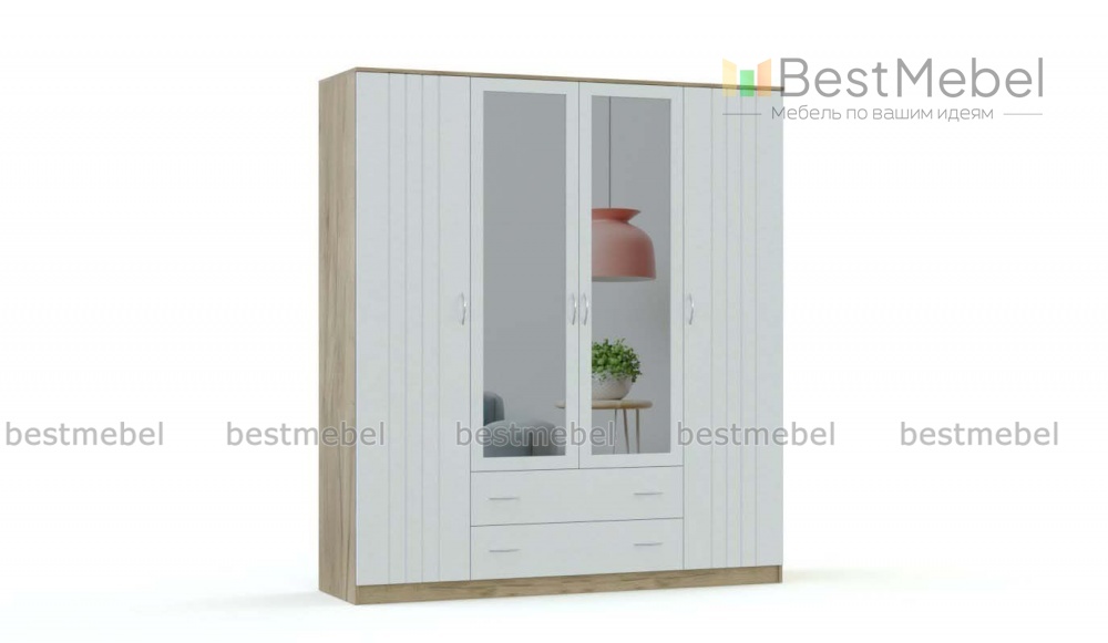 Шкаф распашной Роберта BMS станет не только практичным дополнением, но и декоративным элементом в интерьере вашей квартиры. Фасады благородного белого оттенка, украшенный вертикальной фрезерованной фактурой, выигрышно гармонируют с прямыми зеркалами и корпусом приглушенного древесного оттенка. Функциональность модели обеспечивается за счет платяного отсека со штангой, двух распашных отделений с бельевыми полками и двух выдвижных ящиков. Купить шкаф распашной Роберта BMS, подобрав оптимальные размеры, вы можете в нашем интернет-магазине.