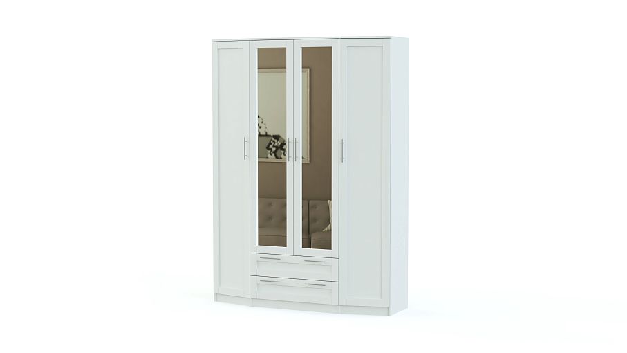 Шкаф распашной Скандинавия BMS выполнен в классическом стиле, а особенностью дизайна станет чуть выступающий трапециевидный фасад. Помимо распашных отделений с бельевыми полками и штангой четырехдверный шкаф оборудован двумя вместительными выдвижными ящиками. Фрезерованные створки в универсальных белых тонах скомбинированы с полностью зеркальными, удобными для примерки и визуально облегчающими интерьер. Купить шкаф распашной Скандинавия BMS для меблировки спальни или прихожей вы сможете в нашем интернет-магазине.