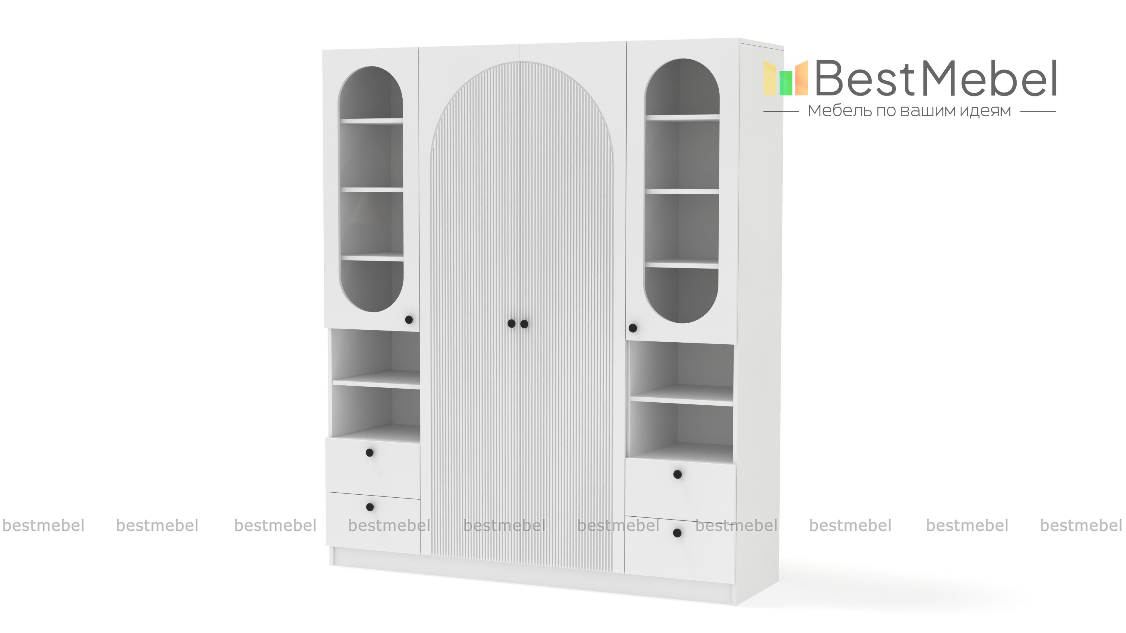 Шкаф распашной Вивьен 24 BMS дополнен двумя комбинированными секциями справа и слева. Система хранения с витринами, полками и ящиками позволяет разместить не только одежду и обувь, но и книги, интерьерные украшения, органайзеры с мелочами. Украшенный арочным вырезом, рельефом и овальными стеклянными вставками фасад выполнен в стильном темном оттенке из плиты МДФ. Купить шкаф распашной Вивьен 24 BMS вы сможете в нашем интернет-магазине с изготовлением по индивидуальным размерам.