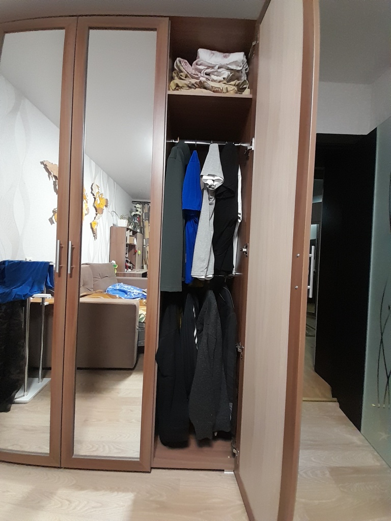 Хороший шкаф. Вместительный. При составлении заказа шкаф был без ножек, но привезли шкаф с ножками и вариант с ножками больше понравился. В отделениях со штангами, добавила ещё по одной штанге. На дверях зеркало не приклеено, сама дверь из зеркала, неожиданно было. Так что, если зеркало вдруг разобьется, будет дыра. Для бюджетного варианта качество хорошее.