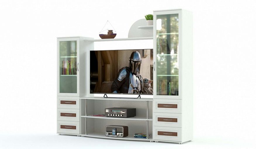 ТВ-тумба № 18 BMS станет альтернативой стенке в интерьере небольшой гостиной. Помимо закругленной трехъярусной тумбы под аппаратуру композиция включает в себя два комбинированных с выдвижными ящиками книжных шкафа и межсекционную открытую полку с надстройкой. Светлые рамочные фасады с контрастными вставками придают разноуровневой тумбе легкий и изящный вид. Купить ТВ-тумбу № 18 BMS для эстетичного обустройства зоны отдыха вы сможете в нашем интернет-магазине.