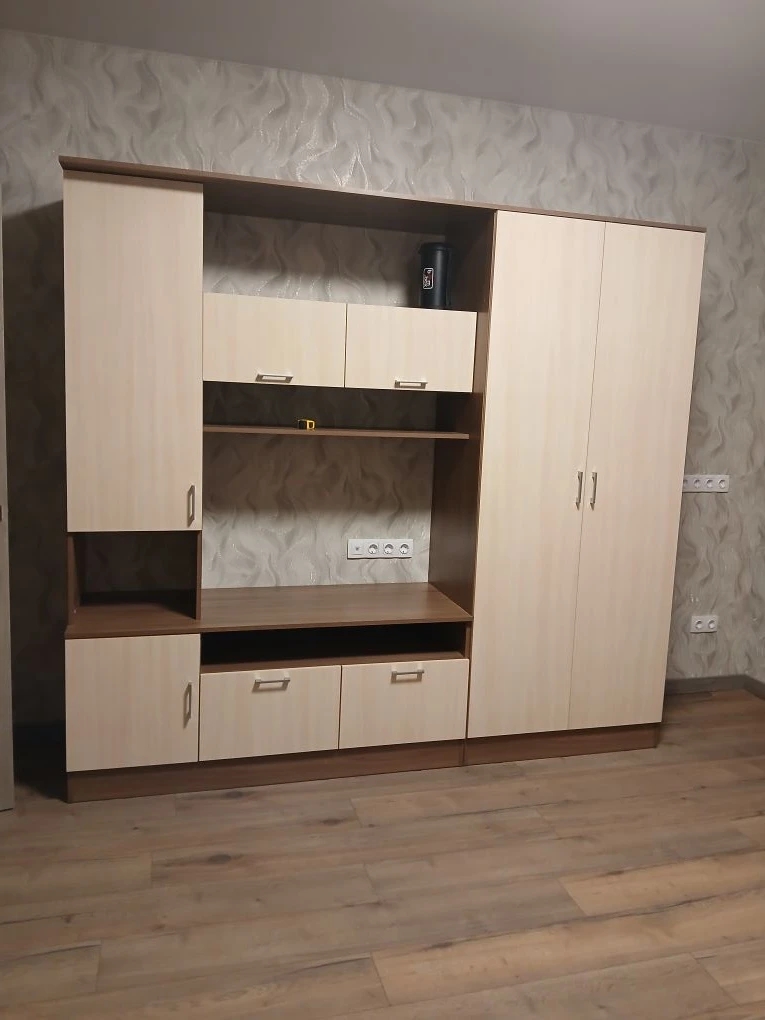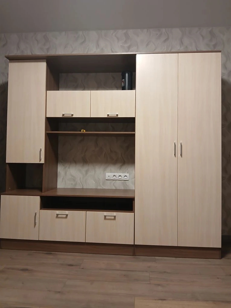 Заказ 00000358225 Обставлял комнату в однушке,естественно места мало. Нужна была гостинная, не просто пара полочек и тумба под ТВ, а полноценная стенка. Чтоб и бельё убрать и одежду повесить. Гостинная Прага отличный вариант. Пенал под бельё и вместительный платяной шкаф. И дизайн интересный, пенал менее глубокий чем вся остальная гостинная, ящики подвесные, крыша общая, так оригинально.  Можно менять размер и по длине и по высоте, можно отзеркалить . Что интересно пляшут от телевизора, выбираешь размер ниши под ТВ и потом подгоняются размеры Шкафов под общий размер гостинной. Поэтому сразу определяйтесь с размером телевизора. Сделали быстро, привезли без проблем, всё хорошо упаковано. Собирал сам. Фурнитуры отсыпают с запасом, остались винты, шурупы, заглушки это очень правильный подход, фабрике респект. Заказал заднюю стенку из ЛДСП в цвет корпуса, всем рекомендую, хоть и дороже, но очень облегчат  сборку и шкафы более монолитные что ли. Единственная просьба к производителю, сделайте инструкцию более подробную, пошаговую. Не всегда понятна последовательность сборки.